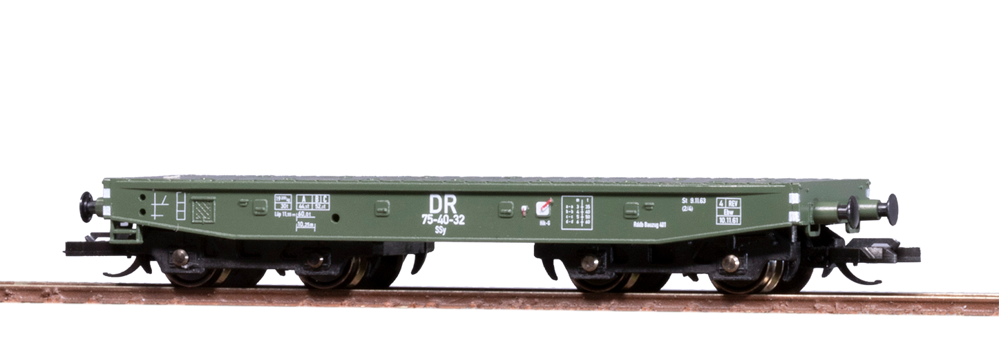 Für den Einsatz in Bauzügen hielt die DR auch vierachsige Schwerlastwagen vom Typ SSy (Rlmmp) vor. Das von Schirmer produzierte Modell gibt es nun erstmals in grüner Farbgebung der DR-Bauzüge für die Epoche III.