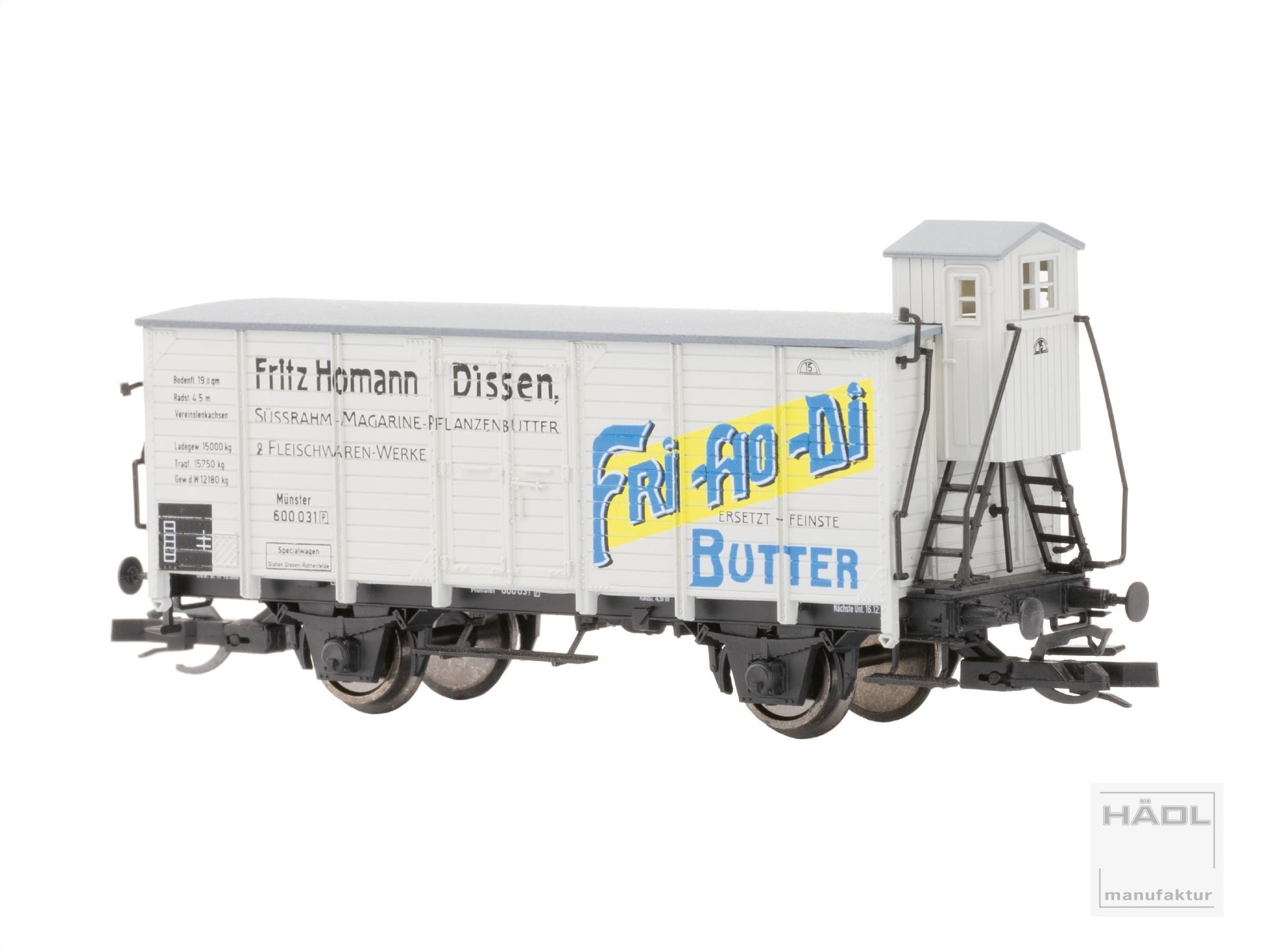 Fritz Homann Dissen war ein Hersteller von Margarine und Fleischprodukten. In den mit auffälliger Werbung bedruckten Wärmeschutzwagen wurde Magarine transportiert.